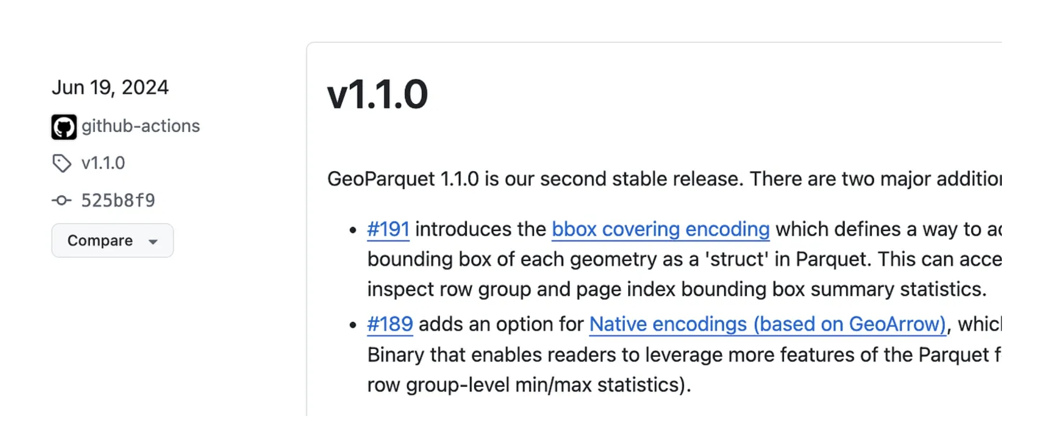 in Parquet’. GeoParquet 1.1 was June 19th of 2024, while the geospatial types landed in Parquet core in March of 2025.