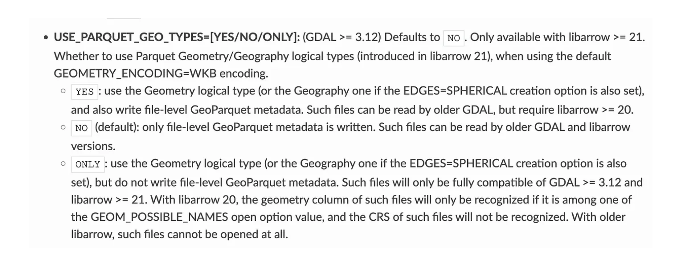 But overall the post got most everything right, and our hope is to be able to provide clearer guidance in a GeoParquet 2.0 spec so that they are completely compatible and eventually it can just Parquet. Note that GDAL/OGR does have the ability to read/write Parquet geo types in version 3.12, and our hope is that when we have GeoParquet 2.0 it’ll make sense to have it write those by default.